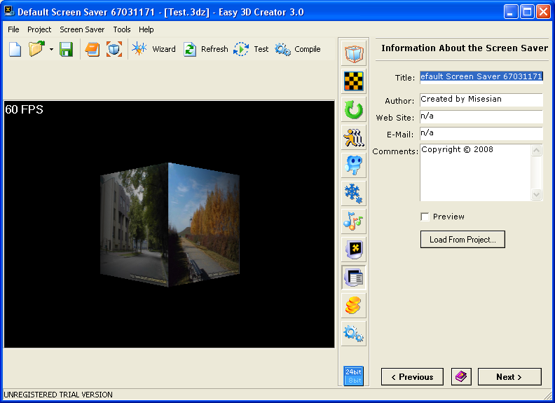 Easy 3D Creator je kvalitně zpracovaný nástroj pro tvorbu spořiče obrazovky, který využijí zejména uživatelé, kteří neovládají žádný programovací jazyk. Výhodou je snadné a přehledné ovládání a integrovaná mediatéka, jež nám umožní vytvářet zajímavé projekty i při absenci vlastních zdrojů. Pro konstantní užívaní programu je nutné zaplatit licenční poplatek.
