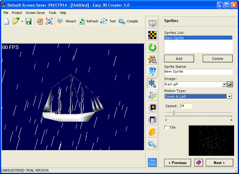 V další kategorii máme možnost definovat chování objektu. Nastavit můžeme rotaci, u které lze snadno určit její směr či rychlost. Analogickým způsobem pracujeme i s pohybem vybraného objektu. Zajímavou funkcí je taktéž určení pohledu kamery, jejíž poloha významným způsobem ovlivní výsledek našeho snažení. Důležitou kategorií je třída Sprites, která nám dovolí k ústřednímu motivu přidat ještě některé z doprovodných efektů. V několika krocích tak můžeme např. přidat padající sníh či déšť, vytvořit matrixový efekt nebo třeba nechat obíhat kosmonauta kolem planety. I zde Easy Creator nabízí sadu vhodných obrázků, není však problém importovat kterékoliv jiné. Každému z přidaných objektů lze určit směr pohybu (např. padání shora doleva dolů atp.).