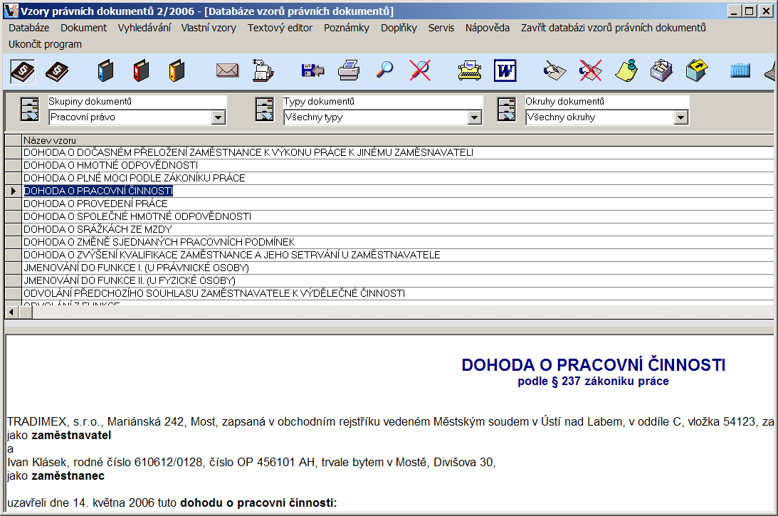 Po prvním spuštění nás program vyzve k potencionálnímu importu databází z některé starší verze programu a požádá nás o upřesnění způsobu aktualizací. Pro lepší orientaci a snadné vyhledání požadovaného dokumentu, jsou veškeré písemnosti třízeny dle skupin, typu dokumentu a okruhů. Ve skupinách nalezneme např. autorské, pracovní nebo obchodní právo, typ dokumentu si můžeme představit jako návrh, smlouvu nebo žalobu, okruh pak reprezentují např. nemovitosti nebo společnost s ručením omezeným. Díky avizovanému trojitému členění nenastal v průběhu testování aplikace problém s nenalezením požadovaného dokumentu v rámci sekund.