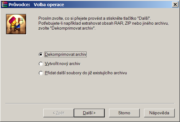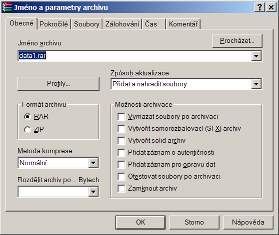 Pro tvorbu archívu plně postačuje vybrat složku určenou k archivaci a kliknout na tlačítko Přidat. Máme možnost vybrat ze dvou výchozích formátů, RAR a ZIP. Důležitou volbou je určení míry komprese, k dispozici je rozpětí Bez komprese (slouží pouze pro sloučení několika souborů v jeden, např. pro snadnější distribuci elektronickou poštou) až po Nejlepší. V závislosti na volbě stupně komprese se mění výsledná velikost souboru a čas nutný k jejímu vytvoření. Jestliže je výchozí soubor nebo složka natolik obsáhlá, že by se na dané médium nevešla, je možné ji jednoduchým způsobem rozdělit.